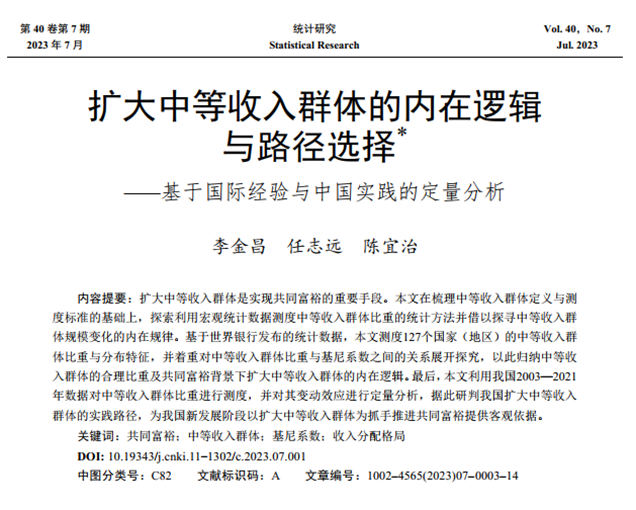 李金昌,任志远,陈宜治.扩大中等收入群体的内在逻辑与路径选择——基于国际经验与中国实践的定量分析[J].统计研究,2023,40(07):3-16.