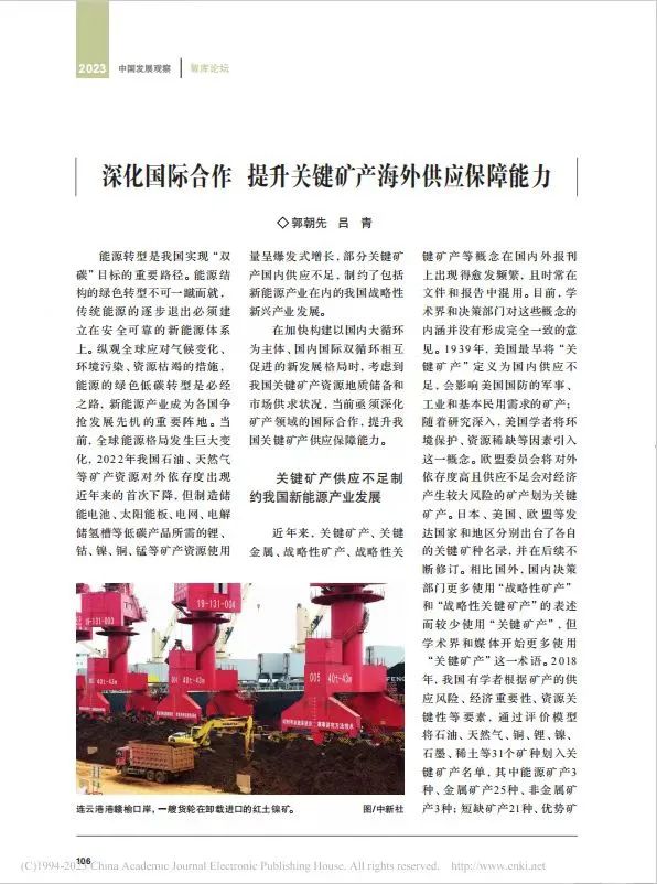 近日,ag真人 2021级产业经济学专业研究生吕青同学和中国社会科学院大学导师郭朝先教授合作的文章《深化国际合作 提升关键矿产海外供应保障能力》在《中国发展观察》2023年第6期发表。文章研究分析了我国当下新能源发展过程中部分关键矿产缺失的现状,并基于新发展格局的构建提出建议。
