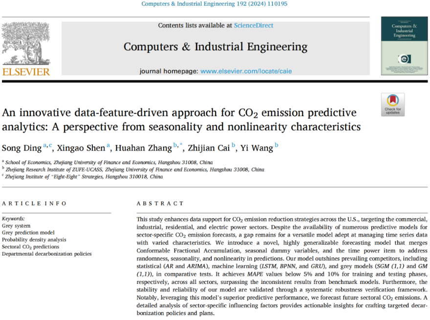 原文:Ding, S., Shen, X.A., Zhang, H.H., Cai, Z.J., Wang, Y., 2024. An innovative data-feature-driven apprach for CO:2 emission predictive analytics: A perspective from seasonality and nonlinearity characteristics. Computers & Industrial Engineering, 192, 110195.