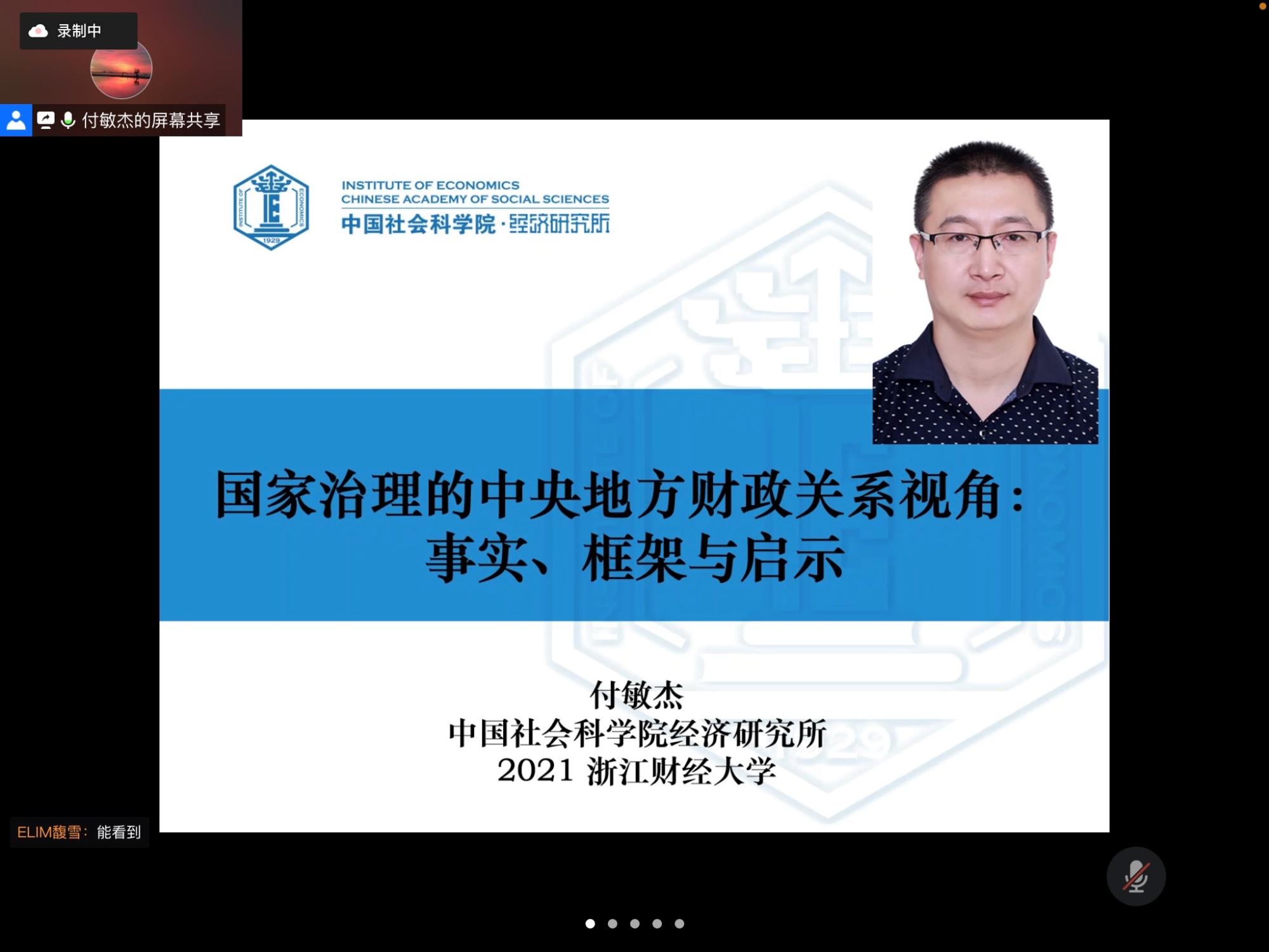 付敏杰老师分别从中国政府间关系的重要性与复杂性、政府间的纵向税收分成、地方非正规纵向竞争、财政纵向竞争视角的国家治理需求、“国家预算”到“全国预算”的演进过程以及纵向财政博弈的国家治理等方面展开论述,指出政府间纵向竞争的缺失会产生地方非正规纵向竞争行为,同时他强调了现阶段国家需要从多方面进行财政改革,进而理清中央和地方在财政方面的关系。