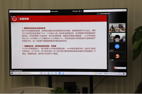 在报告会上,浙江财经大学土地与发展研究院曾灿英老师分享了其在“省级尺度碳排放空间精细化制图”方面的科研成果;公共管理学院研一学生王静怡探索了如何使土地系统转型,以便应对气候变化;中国金融研究院的学生吕浩东专注研究绿色金融,阐述了ESG促进浙江省绿色金融发展的机制……老师们、同学们群策群力,纷纷为实现国家的“双碳”目标献计献策。在作者们汇报之后,童光辉老师、吴绍华老师等点评嘉宾就其选题、实证分析、研究结论等论文内容对汇报进行了全方位的点评,独到的观点赢得了在场师生热烈的掌声。