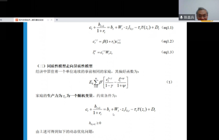 陈老师首先以优化算法的基础——格点法入手,配合值函数法和欧拉方程或贝尔曼方程法,讲述如何利用格点来求解较为复杂的动态优化。其次,还通过论文解读、公式讲解等方式,从专业视角对异质性DSGE模型构建及算法设定进行了具有条理性和逻辑性的论述分析。最后,陈老师将模型构建回归至企业,讲述了企业异质性DSGE模型构建的思路以及如何利用最有化方法解决企业资本存量决策问题。在提问环节陈老师还总结了:“学科绝非仅仅是一种纯粹客观知识的分门别类,它更代表了学术分工的一种特定责任;而问题的提出则是学者们的应有和普遍的责任”。