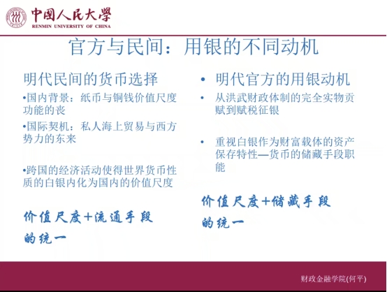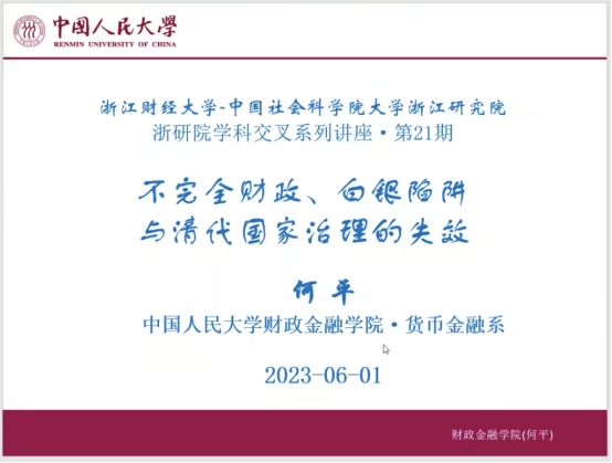 6月1日晚,中国人民大学财政金融学院货币金融系教授、金融学博士生导师、中国金融学会金融史专业委员会副主任何平应邀作题为“不完全财政、白银陷阱与清代国家治理的失效”的专题讲座。本讲座由ag真人