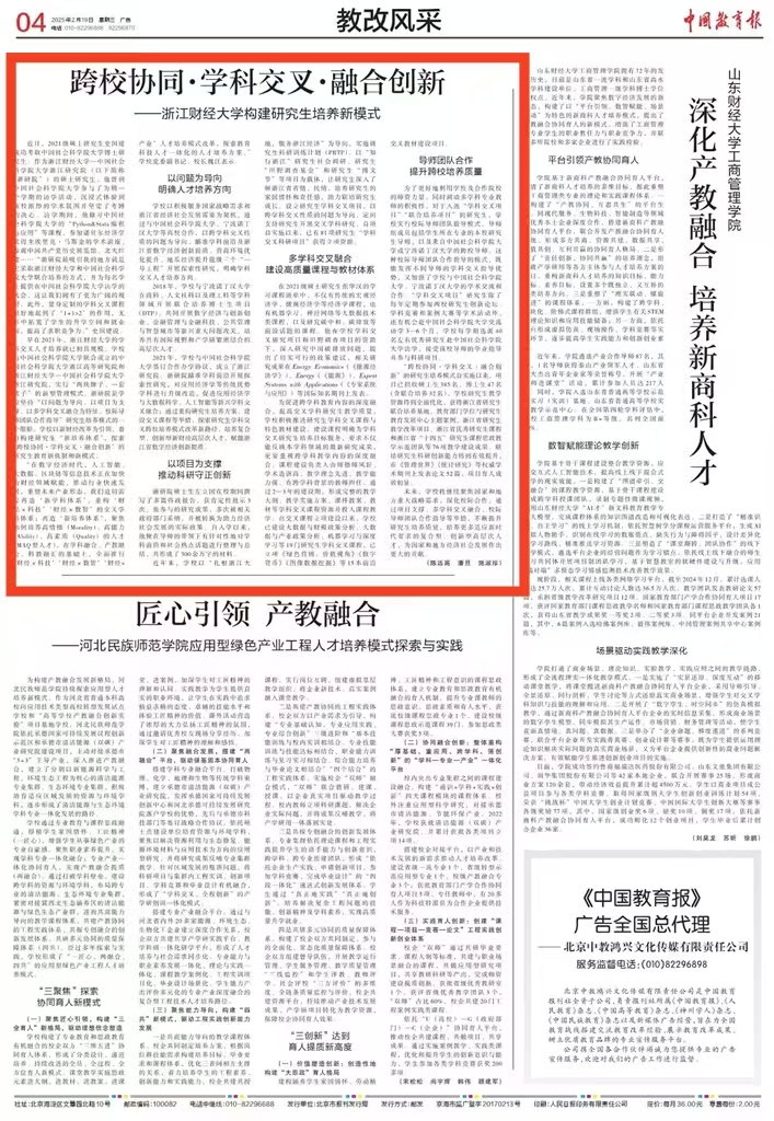 2月19日,《中国教育报》第四版以《跨校协同·学科交叉·融合创新——浙江财经大学构建研究生培养新模式》为题,从人才培养、科学研究、课程与教材建设、校际合作等方面详细报道了ag真人 研究生培养的探索与实践。报道指出,ag真人 以新财经改革为引领,着力构建研究生“新培养体系”,探索“跨校协同·学科交叉·融合创新”的研究生教育新机制和新模式,育人成效显著。